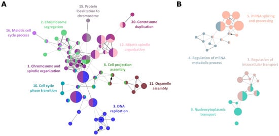 Functional pathway and gene network for DEGs between BCB+ and BCB− oocytes. (A) Enrichment of genes associated with meiosis and mitosis related functional pathways in GO biological process, identified by ClueGO. (B) Enrichment of genes associated with mRNA metabolism and intracellular transport related functional pathways. GO biological process terms in the same group are coloured and presented with their representative group names. The number associated with each group name corresponds to the GO group number in Table S4.