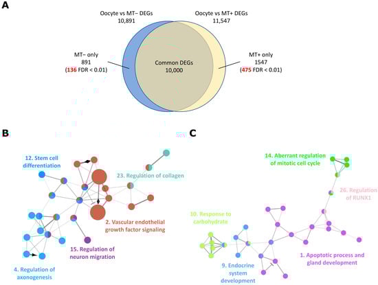 Functional pathways enriched in the DEGs were only found in oocyte to MT supplemented blastocyst transition, identified by longitudinal analysis. (A) Venn diagram representing common and unique DEGs from the two oocyte-blastocyst transition processes shown in Figure 1B. Numbers indicated in red are highly significant DEGs with FDR < 0.01 within unique DEGs from one of the transition processes. (B) Network associated with differentiation and development to blastocyst. (C) Network associated with gland and pancreas development. GO biological process and REACTOME terms in the same group are coloured and presented with their representative group name. The number for each group name corresponds to the GO and REACTOME group number in Table S9.