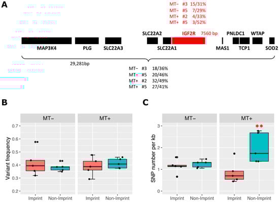 The method requires genetic variations between the two parental pigs. Average SNP frequency in the human genome is about one in every 300 base pairs with a minor allele frequency greater than 1% [,,], and an NGS analysis of four swine breeds using reduced representation genomic libraries identified 372K SNPs []. Therefore, it seems feasible that the allele-specific expression could be analysed by SNP identification with the depth of our blastocyst RNAseq data. We set up detection criteria for the number of reads per transcript, depth of sequence reads, number of SNPs per transcript, and level of a variant, as described in the Methods, to analyse allele-specific expression of genes at the imprinting loci. For example, insulin like growth factor 2 receptor (IGF2R) on Sus scrofa chromosome 1, one of the most characterized imprinted genes in human and mouse genomes [,,], encodes 7560 bp transcripts (Accession no NM_001244473). In blastocyst sample MT+ #5, derived through supplementation, its RNAseq data identified three SNPs with a mean variant frequency of 52% (Figure 5A). In the same data, 27 SNPs were identified in a total transcript length of 29,281 bp containing 10 neighbouring genes. SNP frequency, calculated by SNP number divided by transcript length (kb), was used as an indicator of mono-allelic or bi-allelic expression at low and high frequency, respectively. In the RNAseq data set MT+ #5 (mtDNA supplemented blastocyst), the SNP frequency for IGF2R was 0.40 SNP per kb transcript (SNP/kb) whilst there was a 0.92 SNP/kb frequency for its neighbouring genes. This suggests that IGF2R was biased to mono-allelic expression as expected for imprinted genes. Similarly, in RNAseq data set MT− #3 (non-supplemented), the SNP frequency for IGF2R was 1.98 SNP/kb and 0.61 SNP/kb for its neighbouring genes. The even higher SNP frequency for IGF2R than its neighbouring genes suggests that both parental alleles were actively transcribed for this gene in this blastocyst.