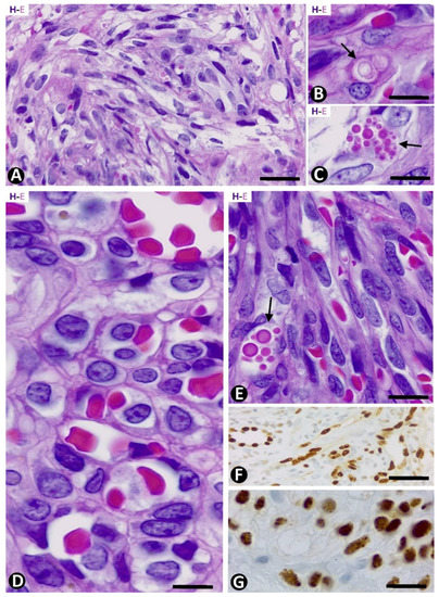 (A–C): KS in the plaque stage. Fusiform cells forming narrow cords with virtual or erythrocyte-occupied lumens are observed in (A). Note degraded red blood cells incorporated in the cytoplasm of an EC in (B) (arrow) and hyaline bodies in (C) (arrow). (D,E): KS in the nodular stage. High cellular fascicles of spindle cells (E) with intraluminal red blood cells. Note a honeycomb-like pattern in a cross-section in (D) and hyaline bodies in (E) (arrow). (F): Nuclear expression for ERG in KS ECs. (G): Human herpesvirus 8 (HHV-8) expression. (A–E) Hematoxylin and eosin. (F,G): Immunochemistry for ERG and HHV-8, respectively. Bar: (A,F): 20 µm; (B,C,E,G): 15 µm; (D): 10 µm.