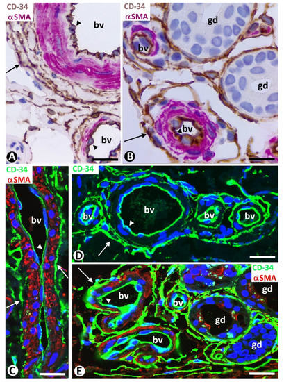 Pre-existing blood vessels (bv in (A,C,D)) and complex structures with vessels and glands (bv and gd, respectively, in (B,E)) in areas without perivascular newly formed vessels or inflammatory infiltrate. Three layers in the pre-existing blood vessels are observed in (A,B), with double immunochemistry for CD34 and αSMA. Intima layer, formed by CD34+ ECs (arrowhead) (brown); media layer, made up of αSMA+ pericytes or vascular smooth muscle cells (red); and external layer with CD34+SCs/TCs (arrows) (brown). Similar images in immunofluorescence in (C,E): Intima layer (arrowhead) (green), media layer (red), and external layer with CD34+SCs/TCs (arrows) (green). In (D), CD34 expression is highlighted in both ECs (arrowhead) and CD34+SCs (arrows) by immunofluorescence, with only CD34 (green). Note the formation of a labyrinthine system by CD34+SCs/TCs around complex structures (blood vessels and glands) in (B,E). Counterstain is with hematoxylin in (A,B) and with DAPI in (C–E). Bar: (A,B): 20 µm; (C,D): 35 µm; (E): 25 µm.