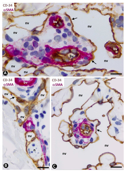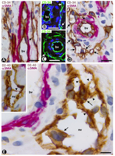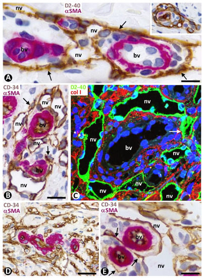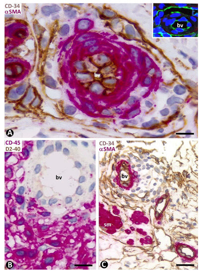 (A–C). Neovessels (nv, corresponding to type 1) around pre-existing blood vessels (bv). The precise location of the neovessel ECs coincides with that of the CD34+SCs/TCs in the apparently non-affected blood vessels or with perivascular inflammatory infiltrate (arrows) (compare with Figure 3 and Figure 4). Note that the pre-existing blood vessels (bv, with αSMA+ pericytes or vascular smooth muscle cells, red) are totally or partially surrounded by the neovessels (without pericytes or vascular smooth muscle cells), giving rise to the image of a vessel within a vessel (promontory sign). Double immunochemistry for CD34 and αSMA. Hematoxylin counterstain. Bar: (A): 15 µm; (B,C): 20 µm.