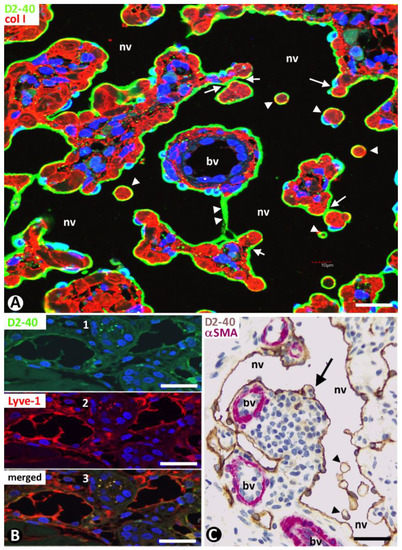 (A): Numerous pillars (arrowheads) and folds (thicker than pillars) in the wide lumen of a neovessel type 1 (nv) are observed by double immunofluorescence for D2-40 (green) and collagen I (red). Note that each pillar and fold shows a cover and a core. The covers are formed by D2-40+ ECs, and the cores present collagen I. An endothelial bridge or nascent pillar (double arrowhead) is observed between two folds. (B): D2-40 (1, green) and Lyve-1 (2, red) co-expression (3, merged) in neovessels. (C): Blood vessels (bv) in a fold with inflammatory cells and various pillars (arrowheads). (A): Double immunofluorescence for D2- 40 (green) and collagen I (red). DAPI counterstain. (B): Immunofluorescence for D2-40 (1, green), Lyve-1 (2, red), and merged (3). (C): Double immunochemistry for D2-40 (brown) and αSMA (red). Hematoxylin counterstain. Bar: (A): 25 µm; (B): 35 µm; (C): 50 µm.