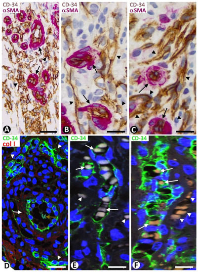 Type 2 neovessels in plaque stage of KS. (A–D): CD34+ neovessel ECs (brown in (A–C) and green in (D)) (arrowheads) are observed around pre-existing blood vessels in which αSMA+ pericytes and vascular smooth muscle cells are seen (red, arrows). Note that neovessel ECs are present where delimiting CD34+SCs/TCs were located in non-affected vessels. (E,F): Red blood cells are observed in the neovessel lumen (arrows) and the interstitium (arrowheads). (A–C): Double immunochemistry for CD34 (brown) and αSMA (red). Hematoxylin counterstain. (D): Double immunofluorescence for CD34 (green) and collagen I (red). (E,F): Immunofluorescence for CD34. DAPI counterstain. Bar: (A,D): 35 µm; (B,C,E,F): 20 µm.