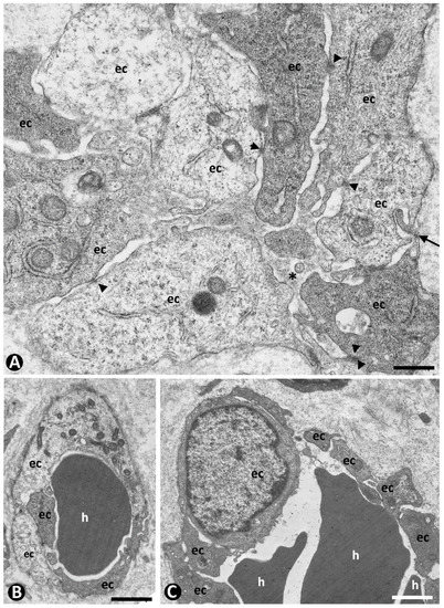 Ultrastructural characteristics of type 2 neovessels. ECs with discontinuities, different electron densities, small interendothelial junctions (arrowheads), and a peg-and-socket junction ((A), arrow) form neovessels with virtual lumen ((A), asterisk) and one (B) or several. (C) Red blood cells (h). Ultrathin sections. Uranyl acetate and lead citrate. Bar: (A): 0.7 µm; (B): 1.5 µm; (C): 1 µm.