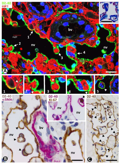 (A): Transformed CD34+SCs/TCs are observed lining a divided neovessel. Note processes of CD34+SCs/TCs lining neovessel cells extending between and around collagen fibers (at higher magnification in 1–4). One bridges the two points of the neovessel wall (4). (A) Similar structure is seen in the neovessel lumen with a pillar-like aspect (cover formed by ECs and core by collagen) (5). (B,C): Neovessels showing numerous intraluminal pillars. Insert of (B). Nuclear Ki-67 expression in a covering cell of a pillar. Observe Ki-67 expression in a nucleus of a pillar-covering cell (insert of (B)). (A) and 1–5: Double immunofluorescence for D2-40 and collagen I. DAPI counterstain. (B,C): Double immunochemistry for D2-40 and αSMA. Hematoxylin counterstain. Insert of (B): Double immunochemistry for D2-40 and Ki-67. Hematoxylin counterstain. Bar: (A,B): 10 µm; (C): 25 µm.