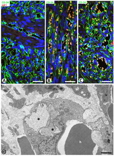 (A–C): Numerous type 2 neovessels (CD34+ ECs, green) and scarce and weak expression of collagen I (red) are observed in the nodular stage of KS. Note in (A) the interposed pre-existing blood vessel (bv), and in (B,C) one or several red blood cells in the lumen of different size neovessels, in longitudinal and transversal sections. (D): Ultrastructural image of a neovessel with an intraluminal red blood cell (h) and an EC showing intracytoplasmic degraded red blood cells (asterisks). (A): Double immunofluorescence for CD34 (green) and collagen I (red). (B,C). Immunofluorescence for CD34. DAPI counterstain (D): Ultrathin section. Uranyl acetate and lead citrate. Bar: (A–C): 25 µm; (D): 1.5 µm.