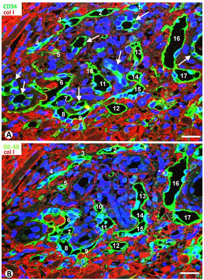 Two images were obtained from serial sections for confocal microscopy, in which the neovessels (1–17) are observed expressing CD34 in (A) and D2-40 in (B), while the pre-existing blood vessels (arrows) are positive for CD34 (A) and negative for D2-40 (B). Note how the arrangement of neovessels around pre-existing blood vessels is similar to that of CD34+SCs/TCs, as well as the evident neovessel lumens alternating with slit-lumens or small spaces. A discontinuity in the lining and an area of the initial formation of a fold centered by collagen are observed in neovessel 6 in (A), while a complete lining and an area of the well-formed fold are present in the same vessel in (B). The neovessels 13,14,15 that appear isolated in (A) form a continuous lumen in (B) as they converge. (A): Double immunofluorescence for CD34 (green) and collagen I (red). (B): Double immunofluorescence for D2-40 (green) and collagen I (red). DAPI counterstain. Bar: 40 µm.