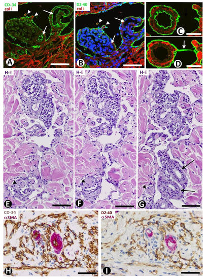 (A,B): Two large folds containing pre-existing blood vessels, showing CD34 positivity in (A) and negativity for D2-40 in (B) (arrows), project into a surrounding wide type 1 neovessel (vessel within vessel: promontory sign). Note the presence of infiltrate inflammation around pre-existing blood vessels, increasing the size of the fold, and two small pillars centered by collagen I forming on the fold surface (arrowheads). (C,D): The appearance and disappearance of a pillar observed in two adjacent sections. (E–G): A large pathway of type 1 neovessels around blood vessels, glands and a nerve. Note the appearance, disappearance and modifications of some structures in the serial sections. (H,I): Elongated type 2 neovessels are seen around pre-existing blood vessels in two of the serial sections, showing small or virtual lumens and expression of markers for ECs of both blood and lymphatic vessels. Double immunofluorescence for CD34 (green) and collagen I (red) in (A,C) and for D2-40 (green) and collagen I (red) in (B,D). Hematoxylin–eosin staining in (E–G). Double immunochemistry for CD34 (brown) and SMA (red) in (H) and for D2-40 (brown) and SMA (red) in (I). Bar: (A,B): 50 µm; (C,D): 35 µm: (E–I): 70 µm.