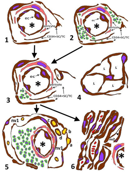 Events of CD34+SCs/TCs during the formation and evolution of neovessels in KS. (1): CD34+SCs/TCs in the external layer of unaffected pre-existing blood vessels (asterisk). (2): Perivascular inflammatory infiltrate (cells in green) encompassed by CD34+SCs/TCs. (3): Formation of small lumens (L) by folded and semi-detached CD34+SCs/TCs. (4): Detail of a neovessel with an intraluminal stellate CD34+SC/TC, originating new lumens (L). Note that pericytes are absent in the neovessel. Transitional events in the expression of markers and of ultrastructural characteristics between CD34+SCs/TCs and neighboring neovessel ECs occur in this phase, as well as the formation of two types of initial neovessels. (5): Evolved neovessels type 1 (nv1). Observe a thick fold, including a pre-existing vessel, within a neovessel (promontory sign). Sequential formation of pillars (a,b,c,d) from EC processes surrounding collagen (yellow) until its transport to the neovessel lumen. (6): Evolved neovessels type 2 (nv2) neighboring to a pre-existing neovessel (asterisk). An EC bridge (arrowhead) is observed in a neovessel.
