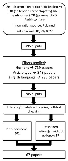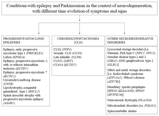 Articles were considered as “non-pertinent” if they described neuropathological, epidemiological, therapeutic, neuroradiological or basic science/molecular biology results, or patients presenting with a phenotype or an etiology not corresponding to the subject of this review (i.e., progressive myoclonic epilepsies, inborn errors of metabolism, and autoimmune disorders). A short list of excluded neurogenic conditions possibly associating Parkinsonism and epilepsy in the context of neurodegeneration is summarized in Figure 1. A detailed and comprehensive list of causes of Parkinsonism in children is available in [11].