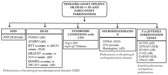 Genetic conditions characterized by the development of an early-onset Parkinsonism following epilepsy or DE-EE will be presented according to the following scheme: Parkinsonism in the setting of neurodevelopmental disorders including DE-EE; syndromic conditions with copy number variations (CNVs) or chromosomopathies; neurodegeneration with brain calcification genes; and juvenile Parkinsonism genes (Figure 3).