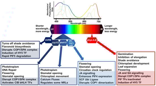 Light is essential for the life of plants. The wavelengths of light with maximum photosynthetic activity are violet blue and red light (BL and RL), and the energy in the light reaching a plant can vary in predictable ways in terms of the time of day, season, and latitude as well as transiently by changes in cloud cover, the topography of the landscape, and shade from neighboring plants [1,4,33]. Therefore, plants in their native environments have adapted to respond appropriately to the range of distinguishable light signals by modifying photosynthetic rates and developmental processes, including germination, de-etiolation, stomatal development, circadian rhythm, and flowering time to suit their environment and adaptations [3,9]. In response to more rapidly changing environmental factors, plants can adapt their physiology, for example, via chloroplast movement, leaf positioning, and stomatal opening [4].