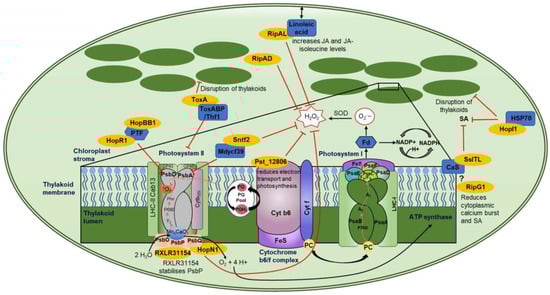 Figure 3. Chloroplast-localized effector proteins and their targets. This figure shows a representative image of a chloroplast and the effector–target interactions with downstream mode of action. The enlarged box shows a schematic of the thylakoid membrane (dark green) with PSII, cytochrome b6/f complex, and PSI (various colors to better visualize subunits) along with effectors targeting various components (dark blue) of these complexes. Effectors are shown in yellow, inhibitory signaling is shown by a red line, while electron transport is shown by black arrows. The ? represents speculative interactions, and double-ended arrows represent movement.