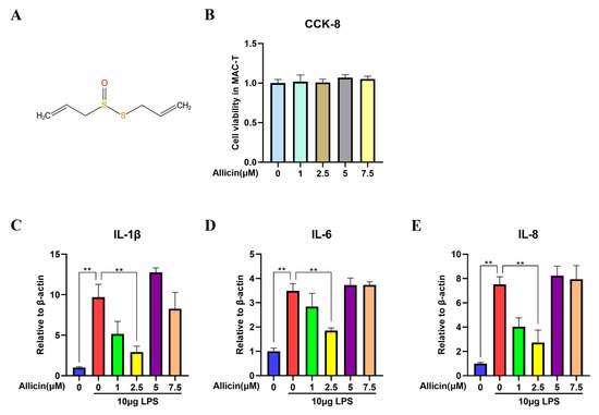 Effect of allicin on MAC-T cell viability and inflammatory cytokine levels in cells. (A) The structural formula of allicin. (B) Effect of allicin on cell viability. MAC-T cells were incubated with different concentrations of allicin (0, 1, 2.5, 5, and 7.5 µM) for 24 h. Cell viability was measured using the CCK-8 assay. (C–E) Effect of allicin on the expression levels of inflammatory cytokines in cells. The mRNA expression levels of IL-1β, IL-6, and IL-8 in MAC-T cells were measured using RT–qPCR with β-actin used as an endogenous control; **, p < 0.01.