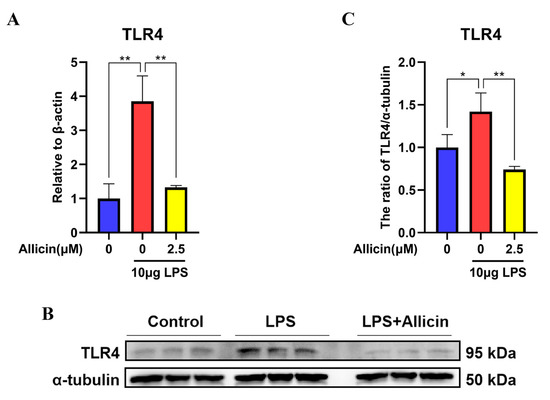 Effect of allicin on TLR4 expression in MAC-T cells. (A) The TLR4 mRNA level in MAC-T cells was detected using RT–qPCR with β-actin used as an endogenous control. (B,C) Expression levels of the TLR4 protein were detected using Western blotting, and α-tubulin was used as a control. *, p < 0.05; **, p < 0.01.