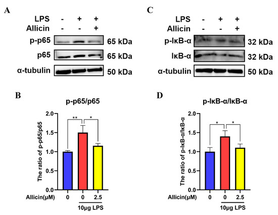 Western blotting was used to measure the protein levels of NF-κB p65 and IκB-α to examine the effect of allicin on the NF-κB signaling pathway. Compared with the control, LPS treatment significantly increased the phosphorylation of p65 (p < 0.01, Figure 4A–D) and IκB-α (p < 0.05, Figure 4A–D). In contrast, the p65 and IκB-α phosphorylation levels were reduced by allicin (p < 0.05, Figure 4A–D).