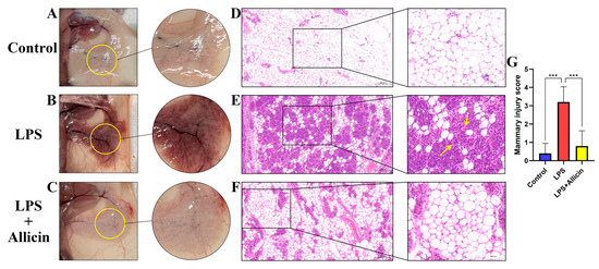 By observing and staining breast tissue with H&E, the following experimental results regarding the effect of allicin on breast tissue injury were obtained. Visually, LPS significantly reddened and congested the breast tissues compared with the appearance of the control tissue (Figure 5A,B); despite this, allicin treatment significantly reduced breast injury (Figure 5C). From the perspective of pathological injury, a normal breast structure was observed in the control group, with no histopathological changes. A significant difference in mammary tissue structure was observed between the LPS group and the control group. The structure of the mammary tissue was disrupted by LPS treatment (p < 0.001, Figure 5D,E,G), as evidenced by increased thickness of the glandular follicular stroma, atrophy, or even necrosis; in addition, inflammatory cells had infiltrated the glandular follicles (Figure 5E). However, the damage to the mammary gland was substantially ameliorated after allicin treatment (p < 0.001, Figure 5F,G).