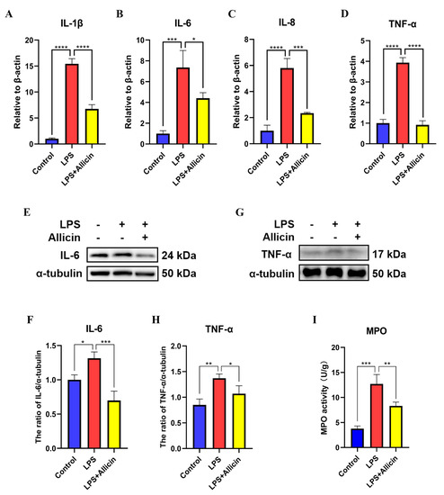 Effect of allicin on the expression of inflammatory cytokine genes in breast tissues. (A–D) mRNA expression levels of IL-1β, IL-6, IL-8, and TNF-α in breast tissues were detected using RT–qPCR with β-actin used as an endogenous control. (E–H) The protein expression levels of IL-6 and TNF-α in breast tissues were detected using Western blotting, and α-tubulin was used as a control. (I) Mammary gland MPO activity assay. *, p < 0.05; **, p < 0.01; ***, p < 0.001; ****, p < 0.0001.