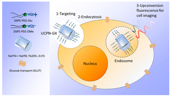 Glycosylated phospholipid-coated upconverting NPs internalized by bladder cancer cells and source of upconverting luminescence under NIR (980 nm) irradiation (adapted from [59]).