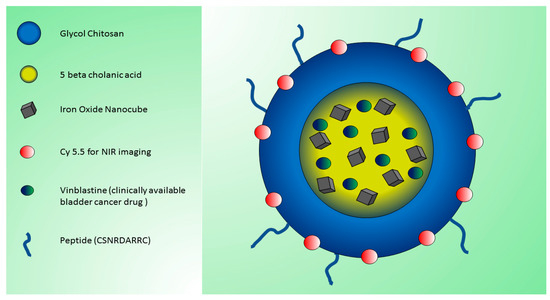 Chemical structure of glycol chitosan NPs conjugated to hydrophobic 5β-cholanic acid, a bladder cancer-targeting peptide (CSNRDARRC), iron oxide nanocubes, and the anticancer drug vinblastine. Cy5.5 was chemically conjugated to the glycol chitosan for NIR fluorescence imaging (adapted from [66]).