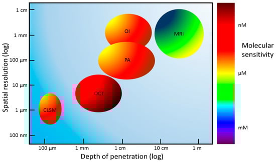 MRI has a molecular sensitivity in the range of micromolar–millimolar, while PA, OI, and CLSM can obtain nanomolar sensitivity. Recently it has been demonstrated that OCT can achieve picomolar sensitivity for in vivo imaging [73,74].
