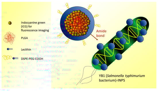 Nanophotosensitizers (indocyanine green-loaded PLGA NPs) were covalently attached to the surface of YB1 (Salmonella typhimurium bacterium) (adapted from [55]).