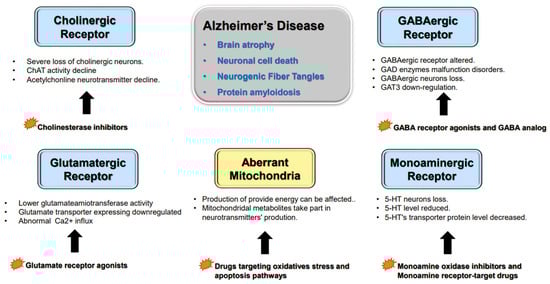 Receptors’ abnormalities and aberrant mitochondria in AD. There are several types of neurons that play important roles in AD. Cholinesterase inhibitors can raise the Ach level. Glutamate receptor agonists could improve the symptoms of AD mice. Researchers have proven that monoamine drugs and inhibitory GABAergic neuron medications can improve cognitive dysfunction in AD patients. Aberrant mitochondria also affect neurotransmitter synthesis and release, and drugs that target oxidative stress and apoptosis pathways reduce AD symptoms.