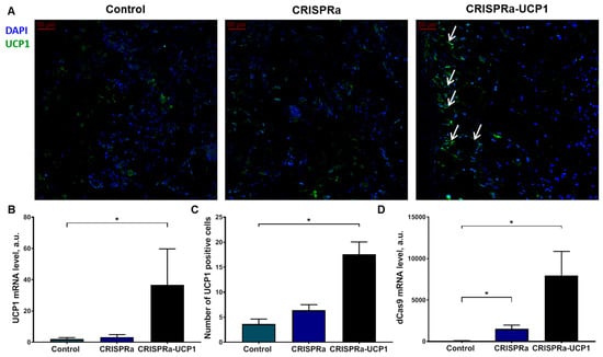 CRISPRa-UCP1 increases the number of UCP1-positive transplanted adipocytes. (A) Representative images of Matrigel sections stained for UCP1 and DAPI; (B) quantification of UCP1 mRNA in grafts; (C) quantification of UCP1-positive adipocytes in graft sections; (D) quantification of dCas9 mRNA in grafts. DAPI—4′,6-diamidino-2-phenylindole; UCP1—uncoupling protein 1. Data are represented as mean ± SEM, Kruskel–Wallis test with post-hoc Dunn’s test, *—significance threshold p < 0.05.