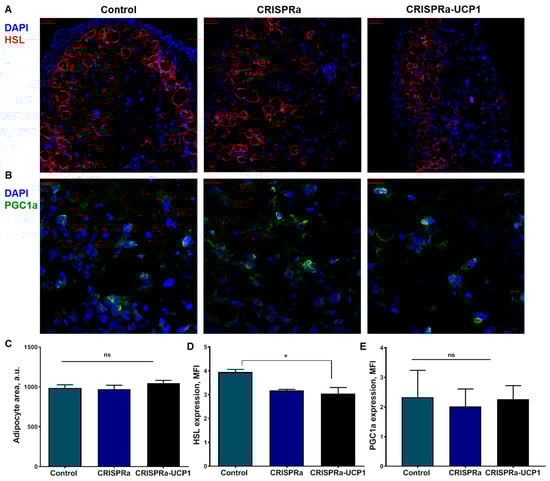 CRISPRa system does not influence adipocyte size or expression of HSL or PGC1α. (A) Representative images of graft sections stained for HSL and DAPI, scale bar 50 μm; (B) representative images of graft sections stained for PGC1α and DAPI, scale bar 20 μm; (C) quantification of average adipocyte area in sections stained for HSL; (D) quantification of HSL expression in adipocytes; (E) quantification of PGC1α expression in adipocytes. DAPI—4′,6-diamidino-2-phenylindole; HSL—hormone sensitive lipase; MFI—mean fluorescence intensity; PGC1α—peroxisome proliferator-activated receptor gamma coactivator-1 α. Data are represented as mean ± SEM, Kruskel–Wallis test with post-hoc Dunn’s test, *—significance threshold p < 0.05. ns—non-significant difference.