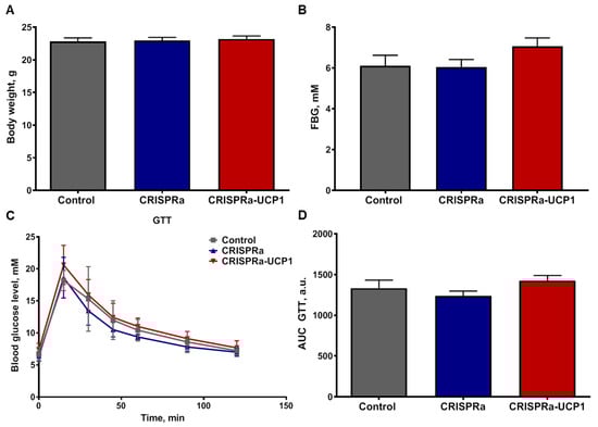 Metabolic parameters of recipient mice 7 days after transplantation of CRISPRa-modified adipocytes. (A) Body weight; (B) fasting blood glucose level (FBG); (C) kinetics of blood glucose level during GTT; (D) the area under the curve (AUC) of GTT. GTT—glucose tolerance test. Data are represented as mean ± SEM, Kruskel–Wallis test with post-hoc Dunn’s test, significance threshold p < 0.05.