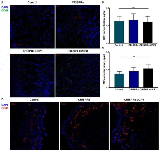 Transplantation of CRISPRa-UCP1-modified adipocytes does not induce inflammation. (A) Representative images of graft sections stained for CD68 and DAPI, scale bar 50 μm; (B) concentration of C-reactive protein in plasma 8 days after transplantation; (C) concentration of tumor necrosis factor a in plasma 8 days after transplantation; (D) representative images of graft sections stained for CD31 and DAPI, scale bar 50 um. Data are represented as mean ± SEM, Kruskel–Wallis test with post-hoc Dunn’s test; ns—non-significant difference.