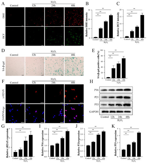 H2O2-induced oxidative damage induced the expression of senescence-associated factors in HK-2 cells. HK-2 cells were treated with 800 µM H2O2 for 12, 24, and 48 h. (A–C) The levels of superoxide anion and reactive oxygen species in HK-2 cells were detected by DHE and DCF staining. Scale bar = 50 μm. (D,E) Detection of senescence levels in HK-2 cells by SA-β-galactosidase staining. Scale bar = 50 μm. (F) Immunofluorescence detection of cellular senescence marker γ-H2AX expression. (G–K) Western blot detection of expression of senescence-related proteins P16, P21, and P53. Values are expressed as mean ± SD. The mean value is the average of the results of three replicate experiments. n = 3. ** p < 0.01.