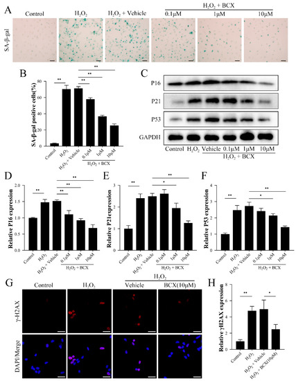 BCX inhibited oxidative stress-induced senescence in HK-2 cells in a concentration-dependent manner. After pretreatment with different doses of BCX (0.1, 1 and 10 µM) for 24 h, HK-2 cells were treated with 800 µM H2O2 for 48 h. (A,B) Senescence levels of HK-2 cells were detected by SA-β-galactosidase staining. Scale bar = 50 μm. (C–F) Western blot detection of expression of senescence-associated proteins P16, P21, and P53. The quantitative analysis was expressed as a relative value to GAPDH. (G,H) Immunofluorescence detection of the expression of cellular senescence marker γ-H2AX. Scale bar = 40 μm. Values are expressed as mean ± SD. The mean value is the average of the results of three replicate experiments. n = 3. * p < 0.05 and ** p < 0.01.