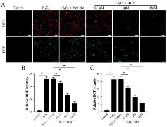 BCX significantly suppressed H2O2-induced oxidative stress in HK-2 cells. After pretreatment with different doses of BCX (0.1, 1 and 10 µM) for 24 h, HK-2 cells were treated with 800 µM H2O2 for 48 h. (A–C) Levels of superoxide anion and reactive oxygen species in HK-2 cells were detected by DHE and DCF staining. Scale bar = 50 μm. Values are expressed as mean ± SD. The mean value is the average of the results of three replicate experiments. n = 3. * p < 0.05 and ** p < 0.01.