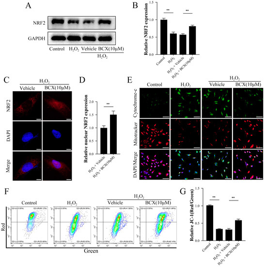 BCX promoted nuclear translocation of NRF2 and maintained mitochondrial function. After pretreatment with BCX (10 µM) for 24 h, HK-2 cells were treated with 800 µM H2O2 for 48 h. (A,B) Western blot detection of NRF2 protein expression in HK-2 cells. The quantitative analysis was expressed as a relative value to GAPDH. (C,D) Immunofluorescence detection of nuclear translocation of NRF2 in HK-2 cells. Scale bar = 5 μm. (E) Immunofluorescence of cytochrome C and Mitotracker staining to label mitochondria. Scale bar = 80 μm. (F,G) Flow cytometry detection of mitochondrial membrane potential levels in HK-2 cells. Values are expressed as mean ± SD. The mean value is the average of the results of three replicate experiments. n = 3. ** p < 0.01.