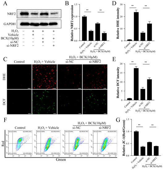 2.5. Silencing NRF2 Reverses the Protective Effect of BCX on Mitochondria and Promotes Oxidative Stress