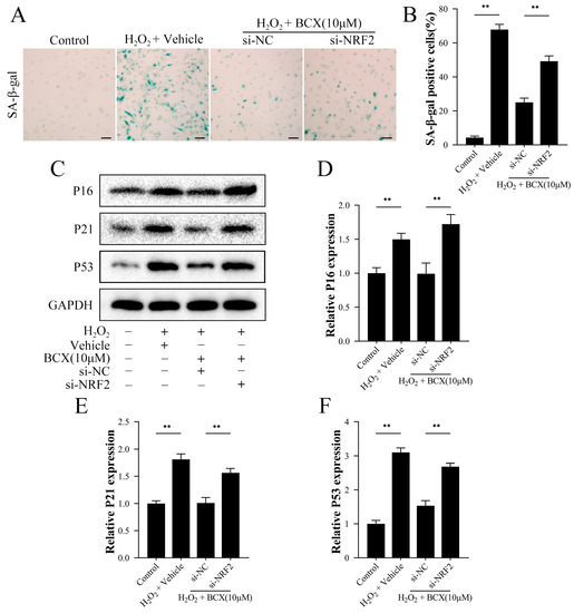 To establish the role of NRF2 in BCX in reducing the senescence of HK-2 cells, we also treated HK-2 cells with NRF2 siRNA. As shown in Figure 6A,B, BCX significantly reduced the number of SA-β-gal-positive cells in the H2O2-induced senescence model. However, NRF2 siRNA treatment inhibited the effect of BCX on the clearance of senescent cells. Consistent with previous results, we found that the addition of BCX to H2O2-induced senescent cells significantly reduced the expression of senescence-associated proteins P16, P21, and P53. However, silencing NRF2 blocked the downregulation of senescence-associated proteins induced by BCX treatment (Figure 6C–F).