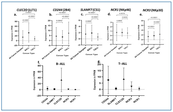 RNA–seq expression in ALL subtypes and other pediatric cancers. (a–e) Expression of each of the receptors in B–ALL and T–ALL subjects in comparison with all other pediatric cancers. (f) Comparison of expression of LLT1, 2B4, CS1, NKp46 and NKp30 in B–ALL subjects. (g) Comparison of expression of LLT1, 2B4, CS1, NKp46 and NKp30 in in T–ALL subjects.