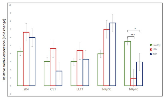 mRNA expression of 2B4, CS1, LLT1, NKp30 and NKp46 in ALL subjects. qRT–PCR data indicating mRNA expression of immune receptors from PBMC isolated from ALL subjects’ blood pre– and post–induction chemotherapy compared to healthy subjects. 1BD, first blood draw indicates sample obtained at diagnosis (day 0). 2BD, second blood draw indicates sample obtained at the end of induction chemotherapy (day 29). * p < 0.05, *** p < 0.005.