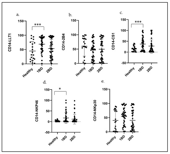 To assess the cell surface expression of LLT1, 2B4, CS1, NKp30 and NKp46 on immune cells, PBMCs were isolated from the whole blood of 42 ALL subjects and 20 healthy subjects as a control. Flow cytometry was used to detect the cell surface expression (FL) indicating the percentage of cells positive for the target receptor on each sample as indicated in Figure 3. Increased cell surface expression of LLT1 (69% positive cells) was observed at diagnosis (1BD) as compared to 45% positive cells in healthy subjects (p = 0.0025) in CD14+ monocytes (Figure 3a). After induction chemotherapy (2BD), there was a decrease in the LLT1 expression (52.1%), which was comparable to the expression in healthy subjects. CS1 expression was more than double at diagnosis (37%) than in healthy subjects (14.7%) (p = 0.0027) in CD14+ monocytes (Figure 3c). NKp46 cell surface expression on monocytes was also significantly elevated in ALL subjects (17%) as compared to only 3% in healthy subjects (p = 0.0160) at diagnosis (Figure 3d). NKp30 cell surface expression on monocytes (Figure 3e) was also elevated but was not statistically significant (p > 0.05), whereas 2B4 expression was downregulated at diagnosis and at the end of induction chemotherapy (p > 0.05) as compared to healthy subjects (Figure 3b).