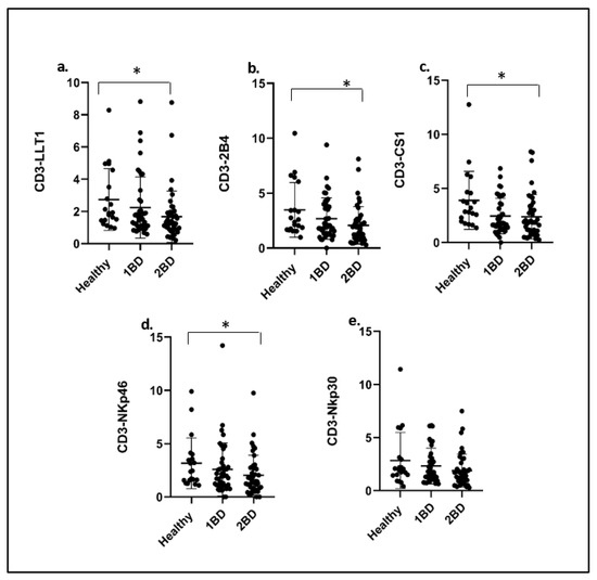 A similar trend was observed in 2B4 (MFIR = 2.07), CS1 (MFIR = 2.39) and NKp46 (MFIR = 2.04) expression on T cells of ALL subjects after induction chemotherapy (day 29) treatment, where expression demonstrated a decrease upon comparison to that of healthy donors of 3.48 (p = 0.0171), 3.89 (p = 0.0111) and 3.16 (p = 0.0473), respectively (Figure 4b–d). The expression of NKp30 pre- and post-treatment did not show any significant (p > 0.05) change (Figure 4e).