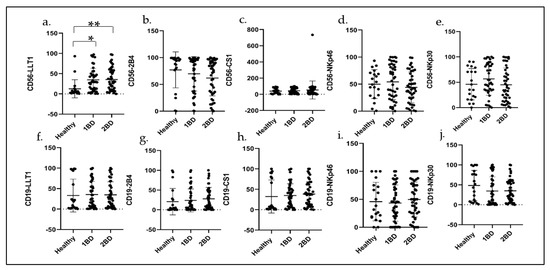 Currently, NK-cell dysfunction has been linked to many cancers, playing at least some part in onset or continuance of the cancer [21,26,27]. Specifically, the NK cells do not appear to achieve the proper activating signals through their receptors. In this study, we first explored the expression of immune receptors by analyzing RNA-seq data from pediatric ALL subjects (B-ALL and T-ALL) from the St. Jude Pediatric Cancer genomic database. Based on our preliminary analysis, we selected five immune receptors for further evaluation in a cohort of ALL and healthy subjects. Three of these receptors, 2B4 (CD244), CS1 (CRACC, CD319) and LLT1 (CLEC2D), were cloned in our laboratory [28,29,30] and have been shown to play a role in other cancers and diseases, such as Systemic Lupus Erythematosus (SLE), prostate cancer and Triple-Negative Breast Cancer (TNBC), as well as other leukemias [31,32,33,34,35,36]. The other two receptors, NKp30 and NKp46, are well-known activating receptors of NK cells against cancer cells and have already been identified as receptors of interest in ALL [37,38,39]. Overall, this study provides new insight to the expression of these receptors and their role in the immune dysregulation in childhood ALL.