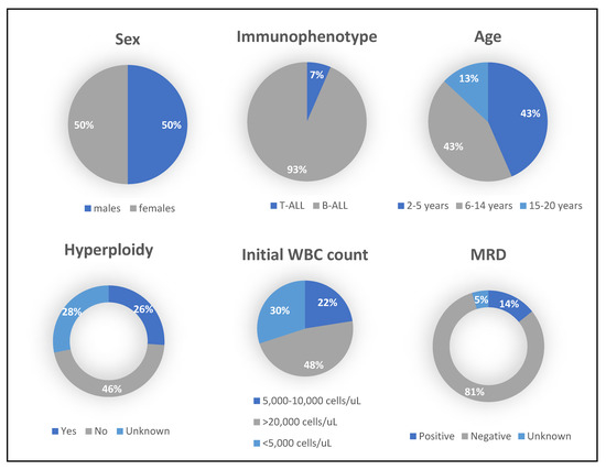 In addition, we also collected some clinical data to understand how the disease affected their cellular proliferation and cytogenetics. Our data showed a massive elevation in white blood cells (WBC) count, where 47% of the ALL subjects’ blood revealed WBC count more than 20,000 cells/µL and four of those subjects surpassed 100,000 cells/µL. On the other hand, 30% of the subjects had a low count below 5000 cells/µL, while 23% of the subjects had a WBC count within the normal range between 5000 and 10,000 cells/µL. Of the 42 subjects, 26% indicated the presence of hyperploidy, some of which are known as trisomies of chromosomes 4, 10 or 17, either in one, two or in all of them. A couple of the subjects had the high-risk B-ALL intrachromosomal amplification of chromosome 21 (iAMP21), while another couple of subjects were Philadelphia chromosome (Ph)/BCR/ABL-positive. Upon completion of induction chemotherapy, the minimal residual disease (MRD) of the majority of subjects (81%) came back negative, while in 14%, it remained positive, as shown in Figure 6 and Table 1. For 5% of the subjects, MRD was unknown.