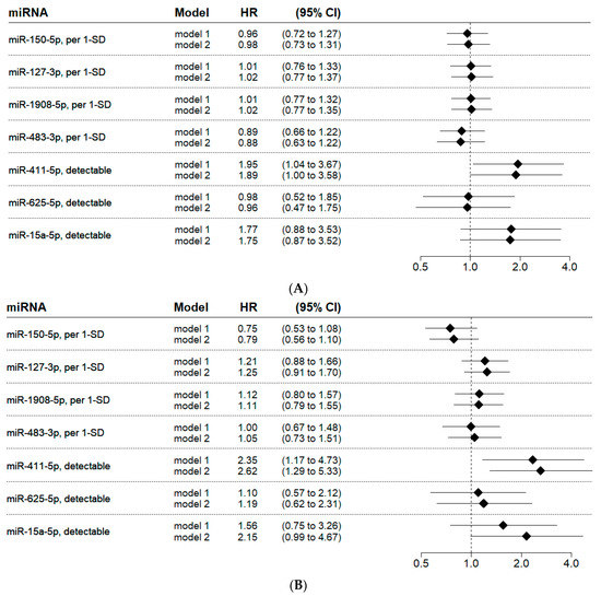 Association of candidate microRNAs with cardiovascular death (A) and major adverse cardiovascular events (B) in patients with atrial fibrillation. Model 1 includes the adjustment for age and sex. Model 2, in addition to the variables of model 1, further adjusts for the history of myocardial infarction and the history of stroke/TIA/systemic embolism. Due to the low detectability of miR-411-5p, miR-625-5p, and miR-15a-5p in RT-qPCR, the variables were dichotomized based on the detectability of the microRNA. Abbreviations: 1-SD, one standard deviation; CI, confidence interval; HR, hazard ratio; and SD, standard deviation.