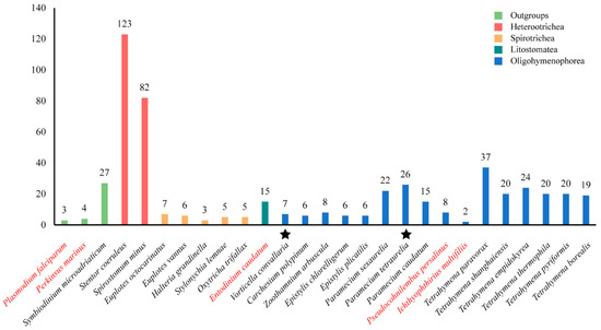 The number of GPCRs in 24 ciliates and three outgroups. Different colors represent different species. Red: parasitic and symbiotic species; black: free-living species. Stars indicate that the species have been shown to undergo genome duplication.