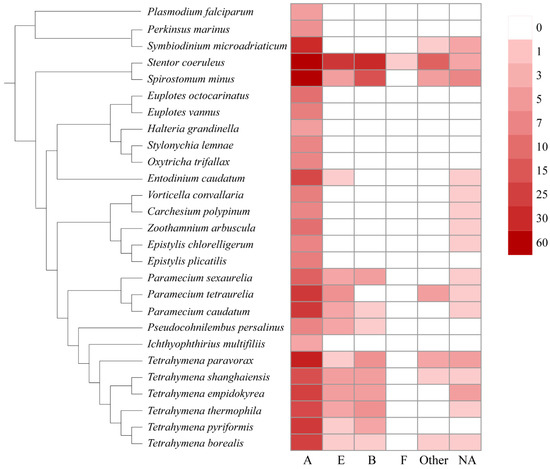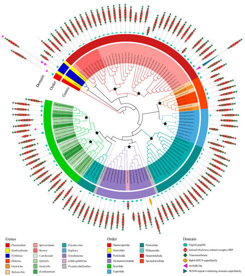 To identify the GPCRs of ciliates, we collected the genome data of 24 ciliates, and the dataset was derived from four sources. Of the collected ciliates, the data for Ichthyophthirius multifiliis, Tetrahymena borealis, Tetrahymena empidokyrea, Tetrahymena paravorax, Tetrahymena pyriformis, Tetrahymena shanghaiensis, Tetrahymena thermophila, Euplotes octocarinatus, Euplotes vannus, Stentor coeruleus, Oxytricha trifallax, and Stylonychia lemnae were obtained from Ciliates.org (https://ciliates.org/landing/ (accessed on 12 October 2022)). The data for Entodinium caudatum, Carchesium polypinum, Halteria grandinella, Pseudocohnilembus persalinus, and Spirostomum minus were retrieved from NCBI (www.ncbi.nlm.nih.gov (accessed on 12 October 2022)). The data for Paramecium caudatum, Paramecium sexaurelia, and Parameciium tetraurelia were obtained from ParameciumDB (https://paramecium.i2bc.paris-saclay.fr/ (accessed on 12 October 2022)). Further ciliate data, including data for Epistylis chlorelligerum, Epistylis plicatilis, Vorticella convallara, and Zoothamnium arbuscula can be accessed through the National Genomics Data Center (https://ngdc.cncb.ac.cn/ (accessed on 12 October 2022)). This dataset covers four classes, eight orders, twelve families, and fifteen genera. In addition, we also identified the GPCRs in three non-ciliates species (used as outgroups), including Perkinsus marinus, Symbiodinium microadriaticum, and Plasmodium falciparum. These data were also obtained from NCBI (www.ncbi.nlm.nih.gov (accessed on 17 October 2022)).