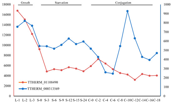 Expression levels of gene TTHERM_01108490 and TTHERM_000313569 at different stages of the life cycle in Tetrahymena thermophila.