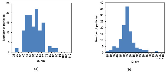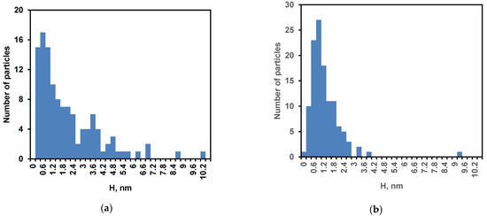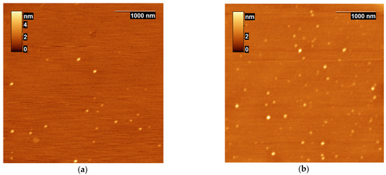 In addition to the well-known particle broadening due to the AFM probe, it can be assumed that the shape of the particles was flattened as a result of their interaction with the mica surface during adsorption and subsequent drying [27]. The mean particle volumes were estimated as 3500 nm3 and 2200 nm3 in samples 1 and 2, which corresponds to the volumes of spherical particles with the radii of 9.4 nm and 8.1 nm, respectively. The heating led to an increase in the size of nanoparticles, probably due to additional aggregation [38]. This can also explain a decrease in the number of nanoparticles in Figure 1a compared to Figure 1b.