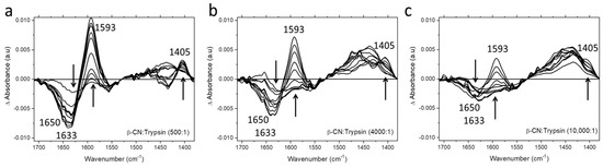 Based on the FTIR-difference spectra for all β-CN to trypsin ratios probed herein (Figure 4), protein secondary structures (such as β-sheets at 1633 cm−1 and α-helices at 1650 cm−1) undergo significant amide changes while the intensities at 1593 cm−1 and 1405 cm−1 increase (due to antisymmetric and symmetric stretching of free carboxylates, respectively), as the enzymatic reaction proceeds for 90 min. The spectral changes were observed to a lesser extent when the trypsin concentration was too low at S0/E0 = 10,000.